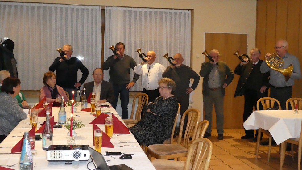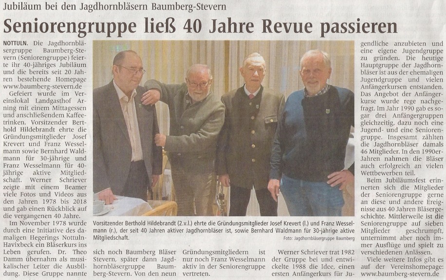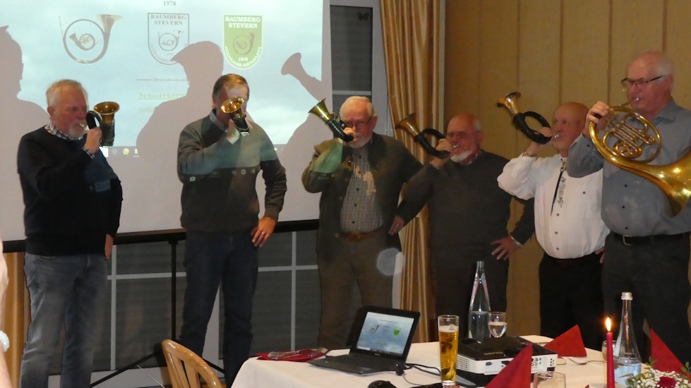 vom Vorsitzenden Berthold Hildebrandt. Die Seniorengruppe macht aber noch immer Ausflüge und spielt zu Auftritten usw. mit ihren Jagdhörnern. Beim 40jährigen Jubiläum hatten die Senioren Baumberg-Stevern am 25. November im Vereinslokal Arning viel Freude bei der Rückblick-Präsentation und ließen den Tag mit Kaffee und Kuchen ausklingen. Bilder vom Jubiläum