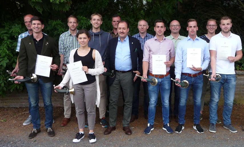 Bläserhutabzeichen - erfolgreiche Bläserprüfung für Jungbläser/innen. Am 11. Juli 2017 fand um 19 Uhr für 13 Jungbläser/innen aus dem Hegering Nottuln-Havixbeck, sowie dem Hegering Münster, im Landgasthaus Arning, Nottuln-Stevern, die Bläserprüfung statt. Die Abnahme des Bläserhutabzeichens wurde von Reinhard Elsbecker, Organisator der Prüfung aus der Kreisjägerschaft Coesfeld, sowie Hella von Lützau, Kreisjägerschaft Münster, beide zuständig für das jagdliche Brauchtum, und Claus Zobel, Leiter der Jagdhornbläsergruppe Ascheberg durchgeführt, sie prüften die 13 Anfänger/innen in ihrem musikalischen Können. Jeder Prüfling musste hierzu in einem Einzelvortrag fünf von 14 Jagdsignalen frei und erkennbar präsentieren, wobei jedem Prüfling erst kurz vor der Prüfung bekannt wurde, welche Stücke er vorzutragen hat. Werner Schriever von der Senioren-Jagdhornbläsergruppe Baumberg-Stevern bildete die acht Jungbläser vom Hegering Nottuln-Havixbeck mit Unterstützung von Norbert Freye-Welp, Trompeter und selbst auch Prüfling, aus. Arno Arning, Inhaber vom Landgasthof Arning und Vereinslokal der Jagdhornbläsergruppe Baumberg-Stevern, nahm ebenfalls an der Prüfung teil (Arnings Jagdhorn liegt immer hinter der Theke und wenn es irgendwie möglich ist, übt er damit). Die sechs Prüflinge der Kreisjägerschaft Münster lernten in den letzten Wochen unter der Leitung von Fabian Feldhaus, Leiter der Jagdhornbläsergruppe Münster-Rüschhaus, die relevanten Jagdsignale. Geprüft wurden vom Hegering Nottuln-Havixbeck: Arno Arning, Florian Fliß, David Gerding, Lukas Neuhaus, Patrik Wedding, Tobias Wenker, Norbert Freye-Welp sowie aus der Kreisjägerschaft Münster: Hannah Friebel, Friedhelm Große Kintrup, Mark Mevissen, Christopher Sieff, Martin Richardsen, Tobias Wagener. Am Ende konnte die Prüfungskommission allen vorgenannten Prüflingen das Bläserhutabzeichen verleihen. Von allen 13 Prüflingen war es Hannah Friebel, die ihre fünf Signale vor der Jury am besten vorgetragen hat. Nach der feierlichen Urkundenübergabe und dem Anstecken des Bläserhutabzeichens, wurden gemeinsam einige Jagdsignale gespielt und der Abend endete musikalisch mit „Jagd vorbei“ und „Halali“. Die Geschichte des Jagdhorn: Die Benennung Horn (Jagdhorn) weist auf den Ursprung des Instrumentes hin, es waren Tierhörner auf denen man Töne blasen konnte. Um 1680 wurden in Frankreich und England die ersten großen runden Parforcehörner gebaut. Herzog Heinrich von Pless (1833-1909) leitete als Oberstjäger des Kaisers seit 1878 die Hofjagden und trug in der hohen Gesellschaft stets ein kleines Jagdhorn (Fürst-Pless-Horn) bei sich, mit dem er Signale während der Jagd gab. So wurden die Signale und das Fürst-Pless-Horn in ganz Preußen und später auch in ganz Deutschland übernommen. Das Jagdhorn ist eines der schönsten Dinge des jagdlichen Brauchtums, Jagdleitsignale werden für die Jagdausübung und Sicherheit der Jagd ausgeführt. Nach einer Jagd wird auch das Signal „Jagd vorbei und Halali“ vor der angetretenen Jagdgesellschaft vorgetragen. Aber auch als letzten Gruß bei einer Beerdigung eines Waidmans/frau wird das Signal dem Toten zur Ehre geblasen. Die Anfänger/innen im Jagdhornblasen wollen nach der Prüfung weitermachen und Hochwildsignale und Märsche/Fanfaren einstudieren. Bericht: Werner Schriever & Hella von Lützau Foto: Franz Wesselmann